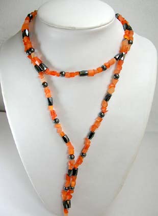 An attractive hematite necklace formed with multi light and dark orange agate stone chip and silver beads. This 36" long magnetic wrap works well on neck, wrist, or ankle. Gives yourself a body relief therapy now!